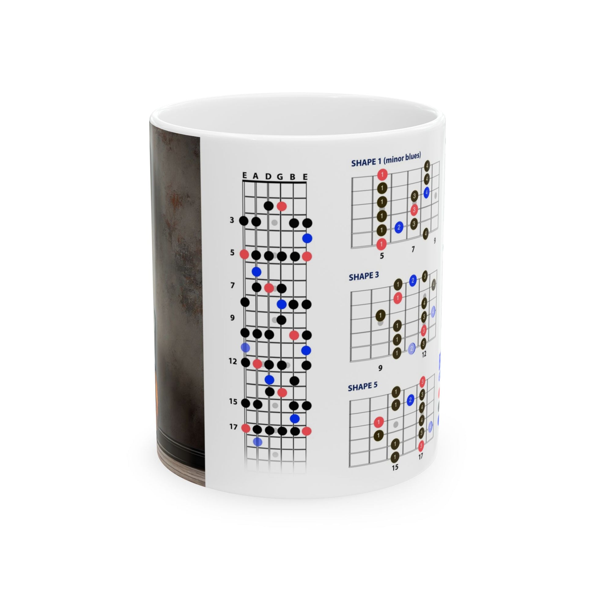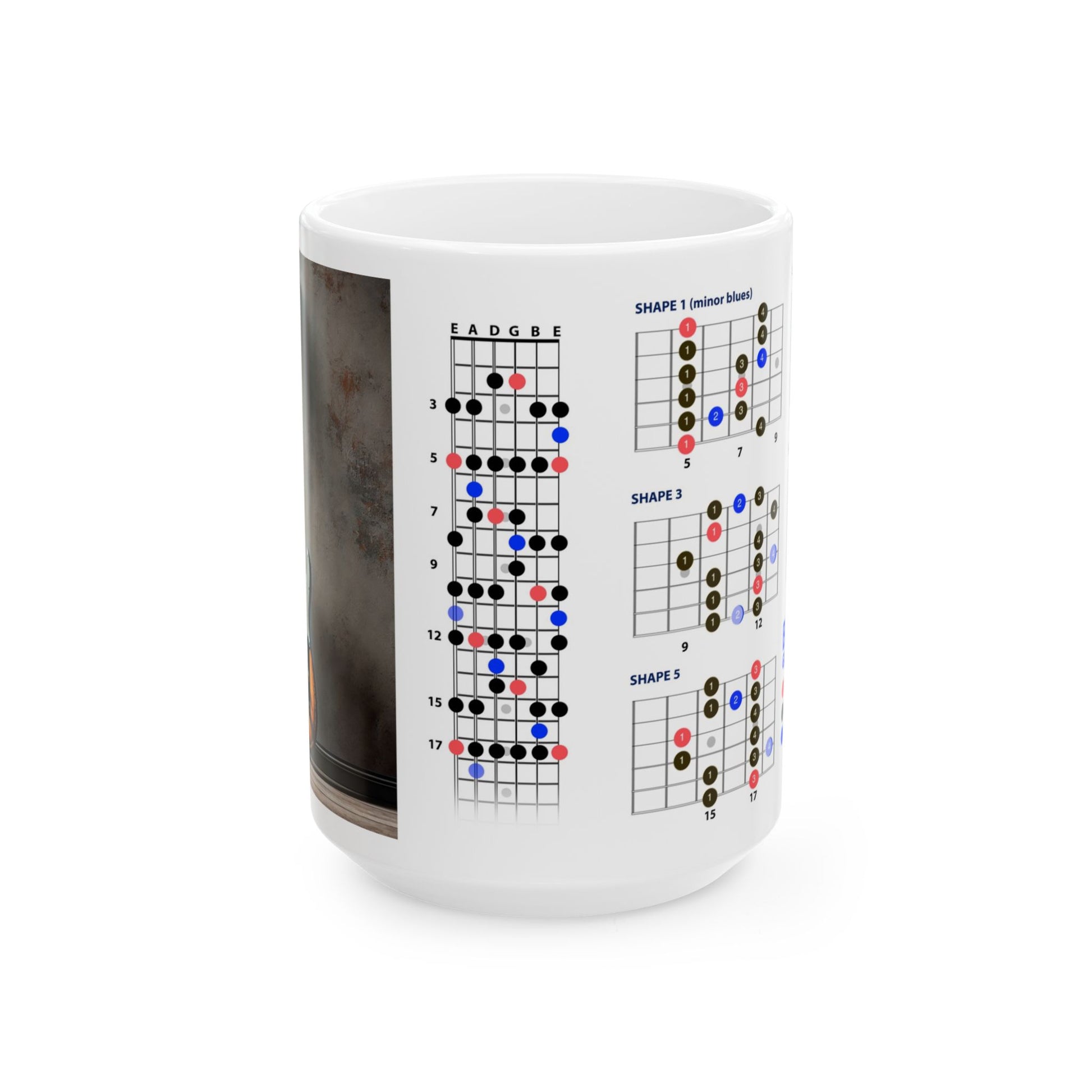 Every great guitarist knows his scales. Use the mug as a daily reminder to practice your scales. Know the scales and you will know how to play all across the neck.
