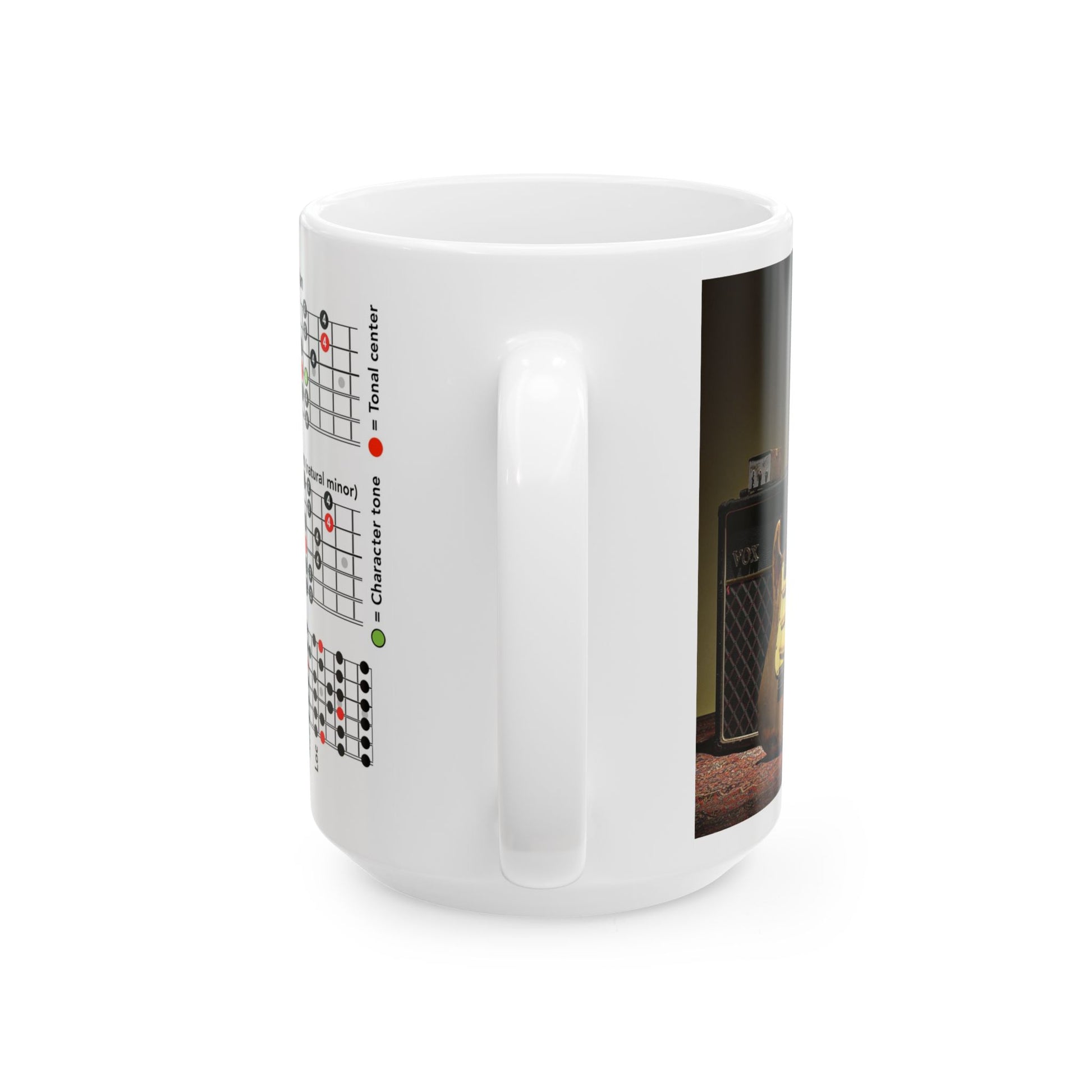 Every great guitarist knows his scales. Use the mug as a daily reminder to practice your scales. Know the scales and you will know how to play all across the neck.