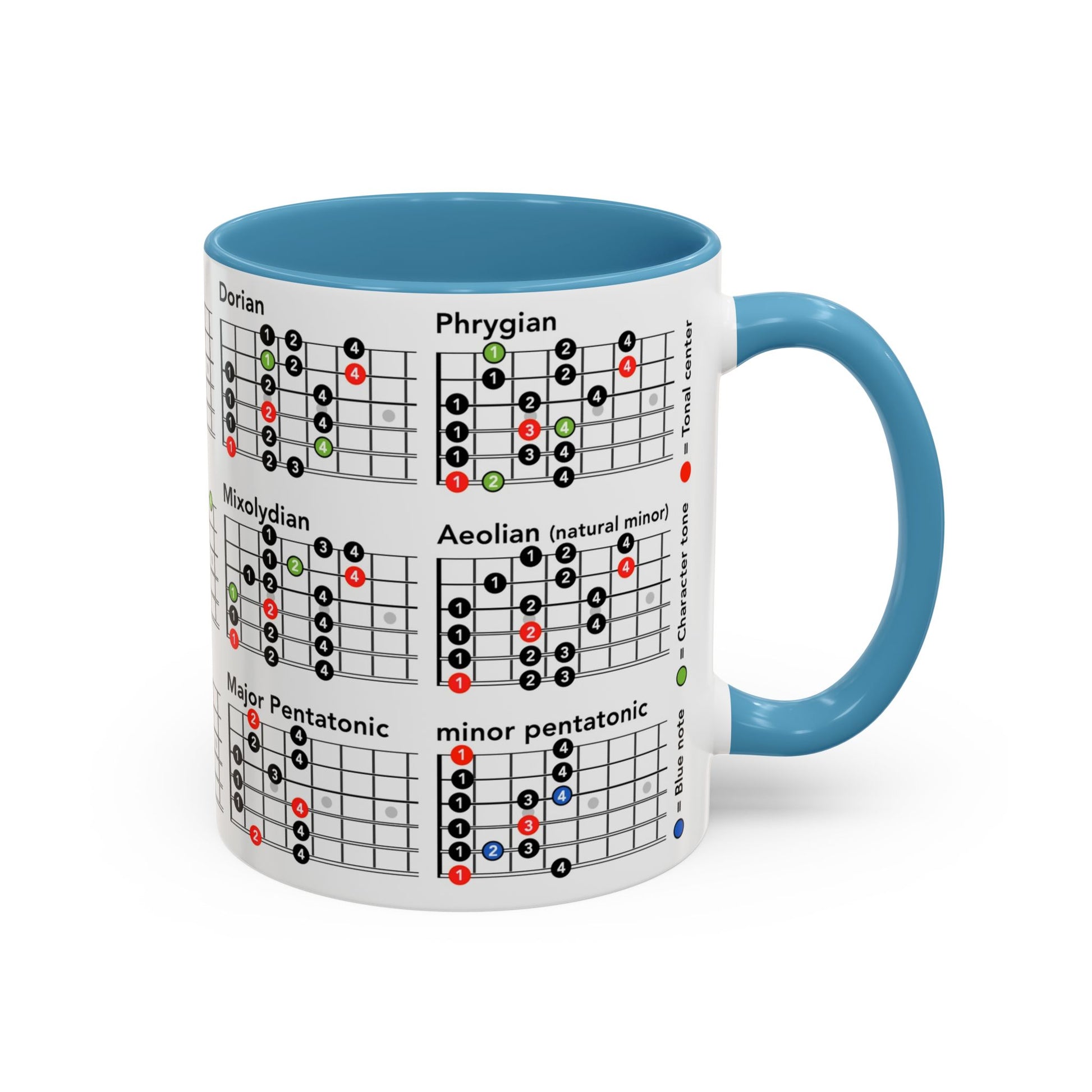 Elevate your daily routine with this beautifully designed Accent Coffee Mug featuring guitar scale diagrams Perfect for musicians or music enthusiasts, this mug is a fun and practical present for anyone who loves music. Enjoy your favorite beverage in style and bring creativity to your kitchen or office space. Ideal for gifting on birthdays, music-themed events, or holidays, this mug inspires with every sip and is a reminder of 3 note per string mode scales and blues scales